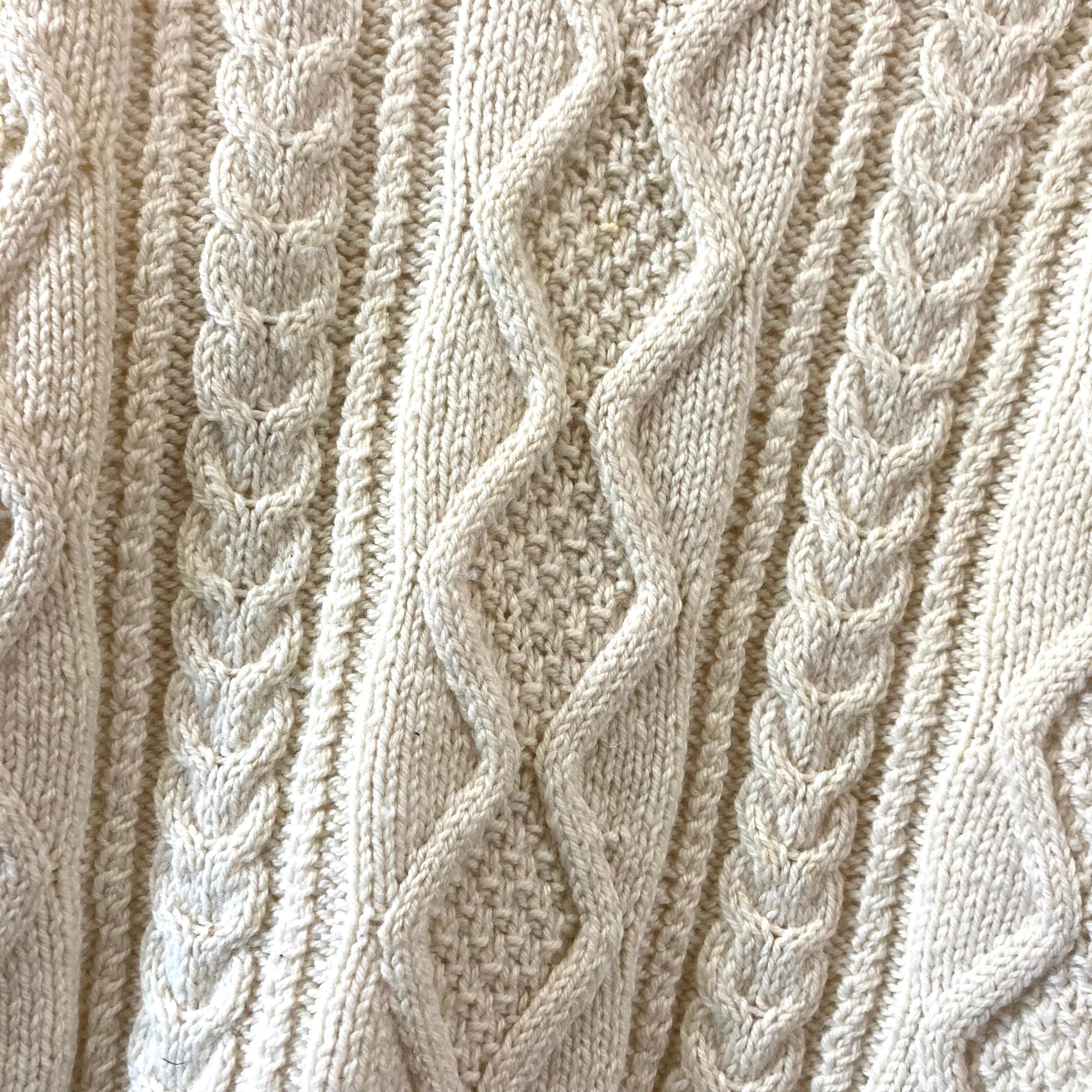 太めのウール糸を使ったクラシックなケーブル編みで、雰囲気抜群のクリームカラー。