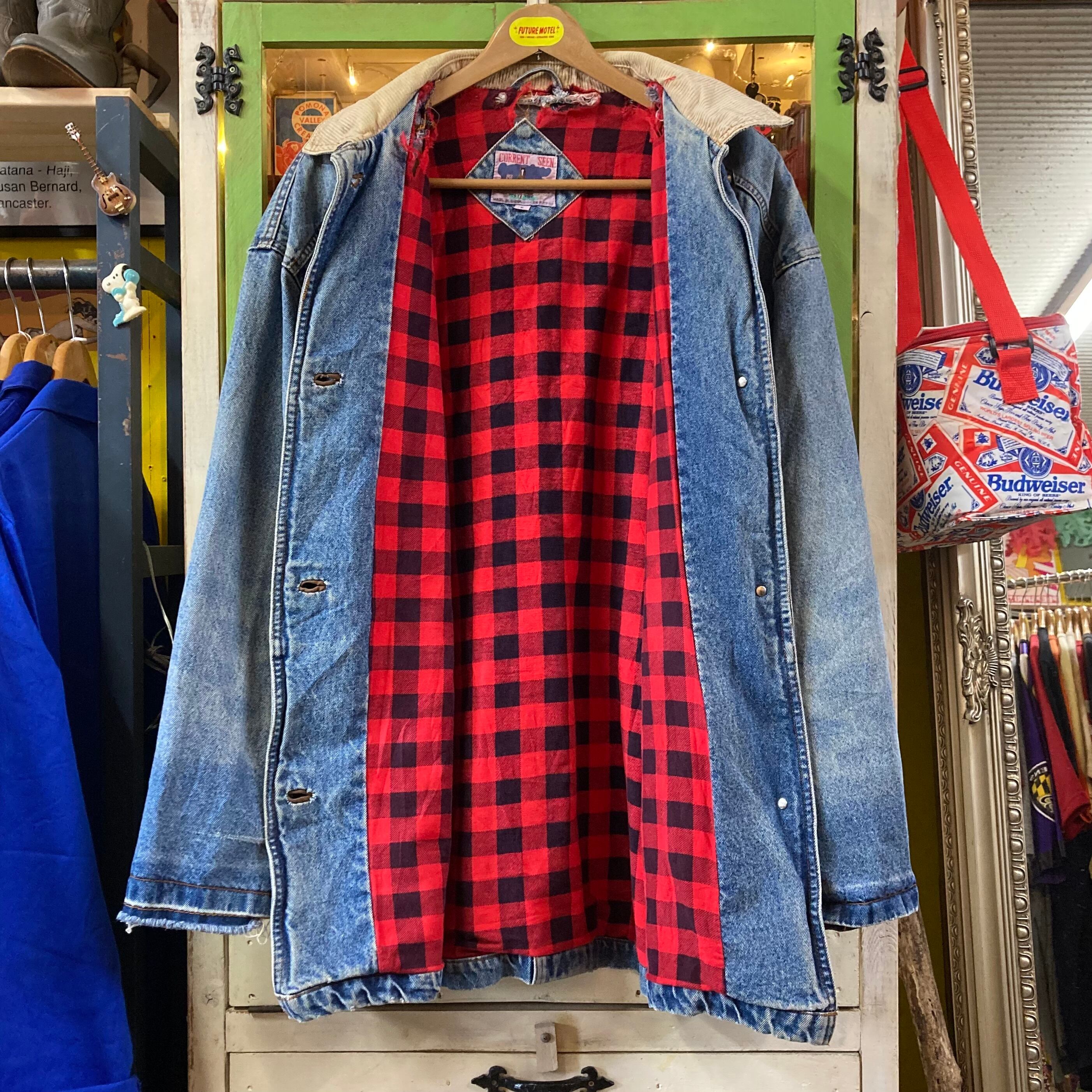 裏地は赤チェック仕様で防寒性もあり、襟はコーデュロイ切り替え。ワーク・アメカジ・ボロ好きにはたまらないディテールです(^^)
