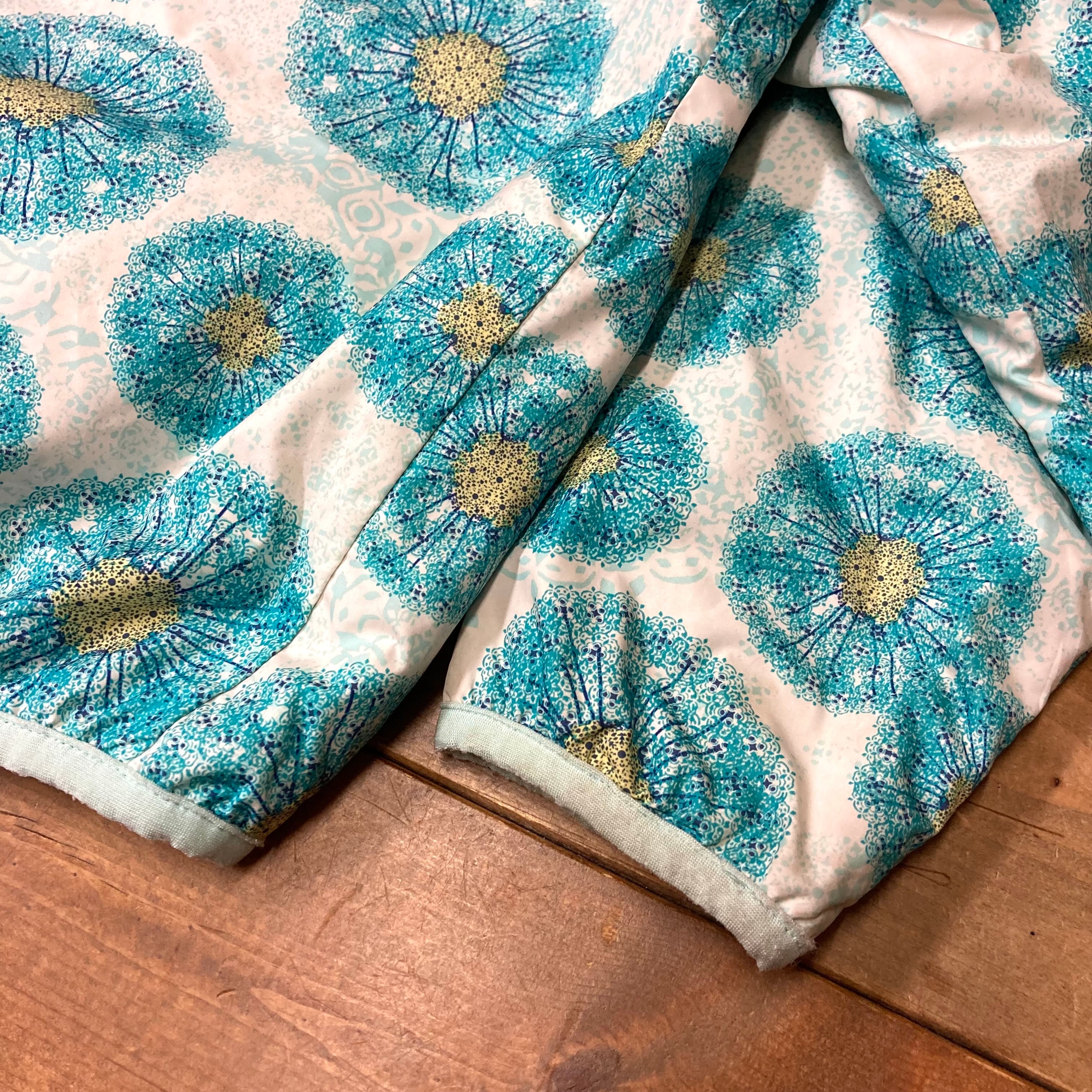 グリーン系の花柄(タンポポの綿毛のようなデザイン)が全面に入った、パタゴニアらしい可愛らしくナチュラルな総柄デザインです♪