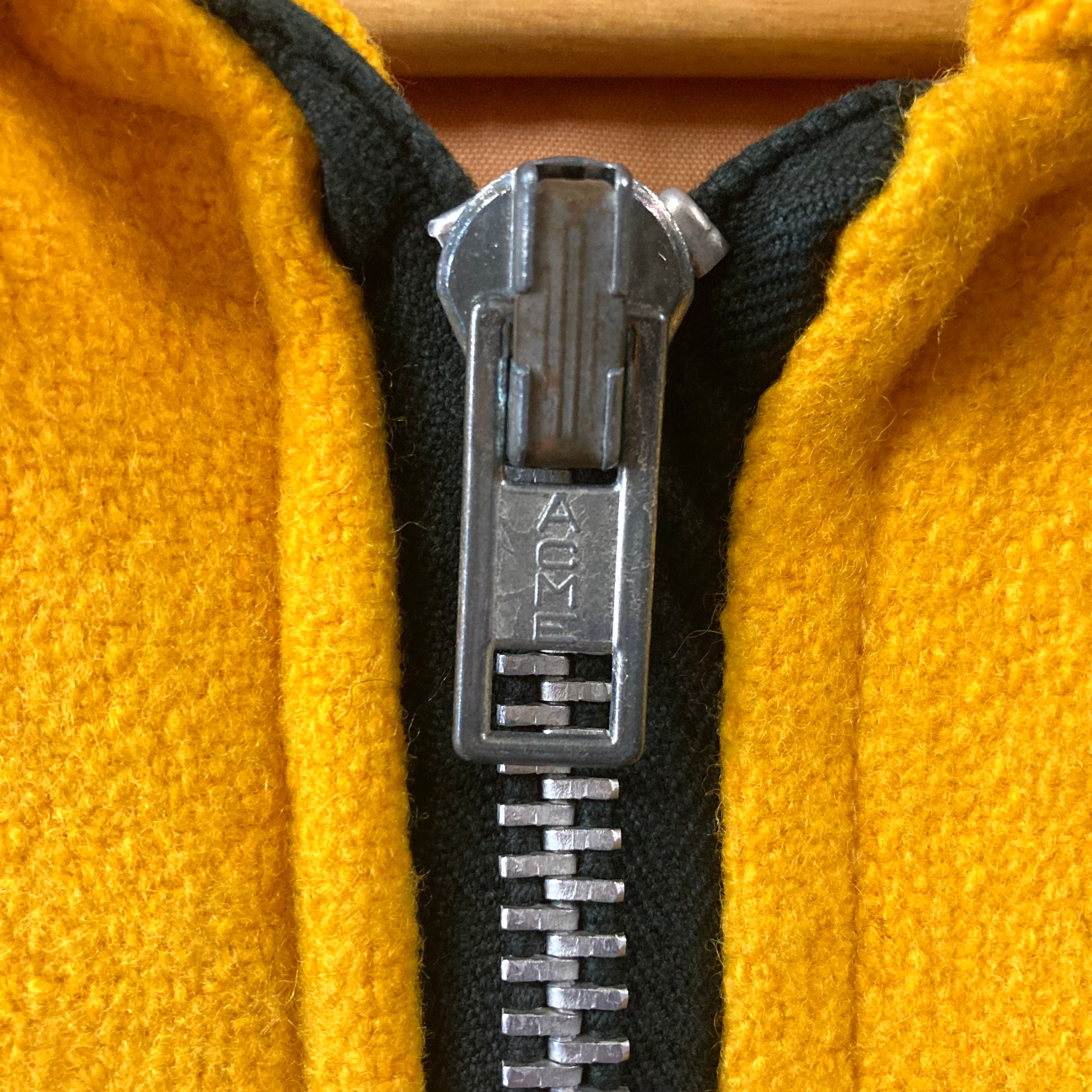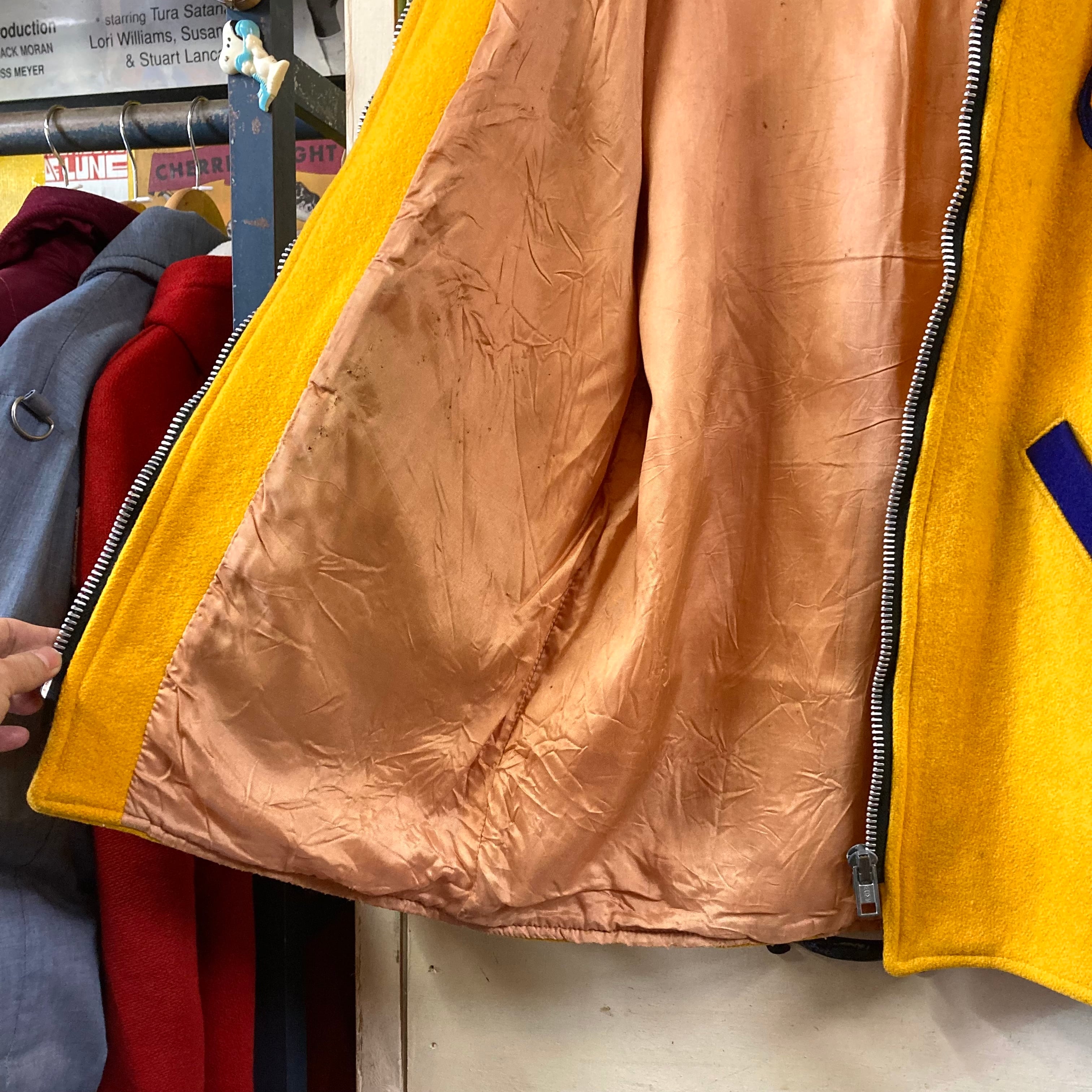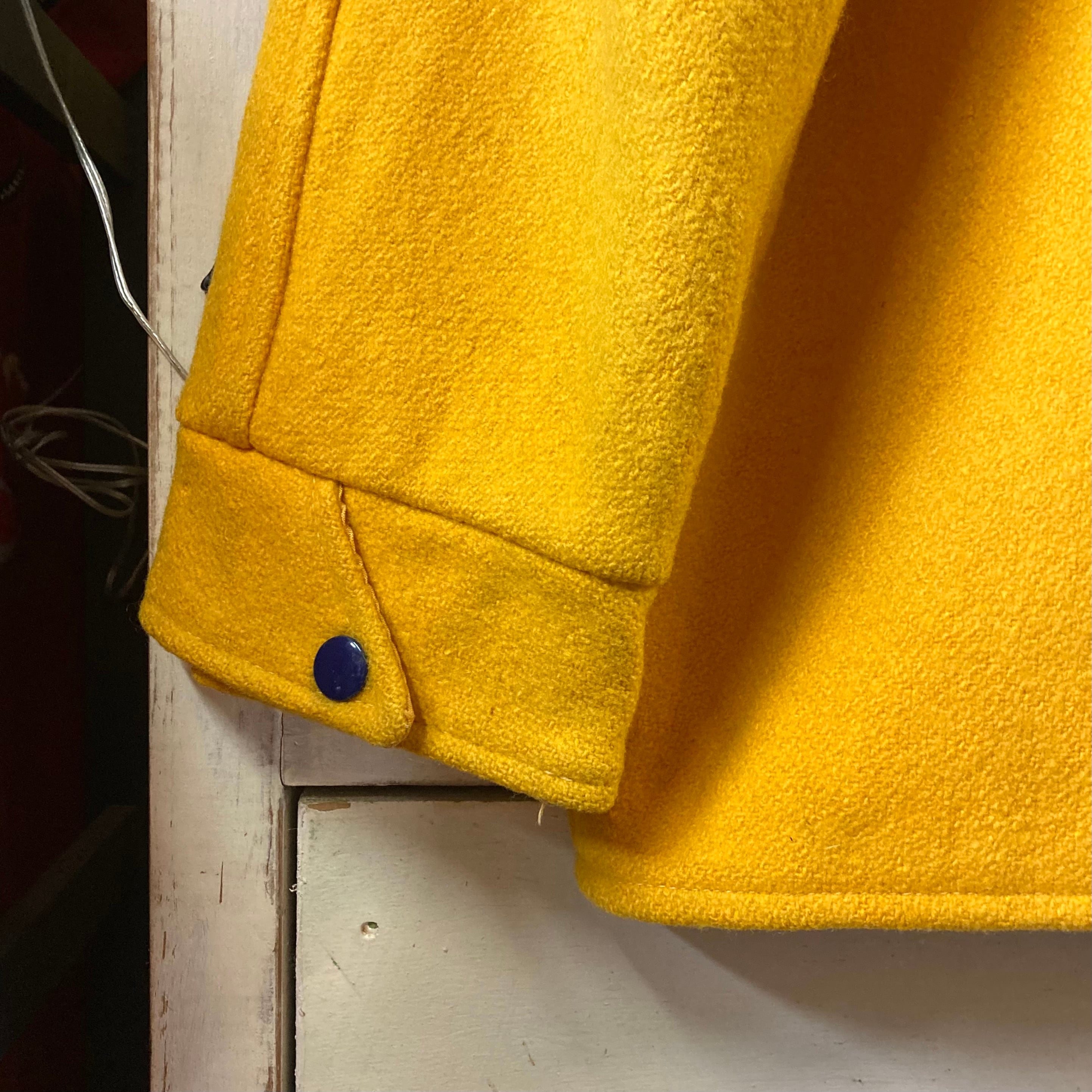 素材は肉厚なウールメルトン。マスタードイエロー×ネイビーの配色、ラグランスリーブのショート丈シルエットで50sらしい完成度の高い一着です。