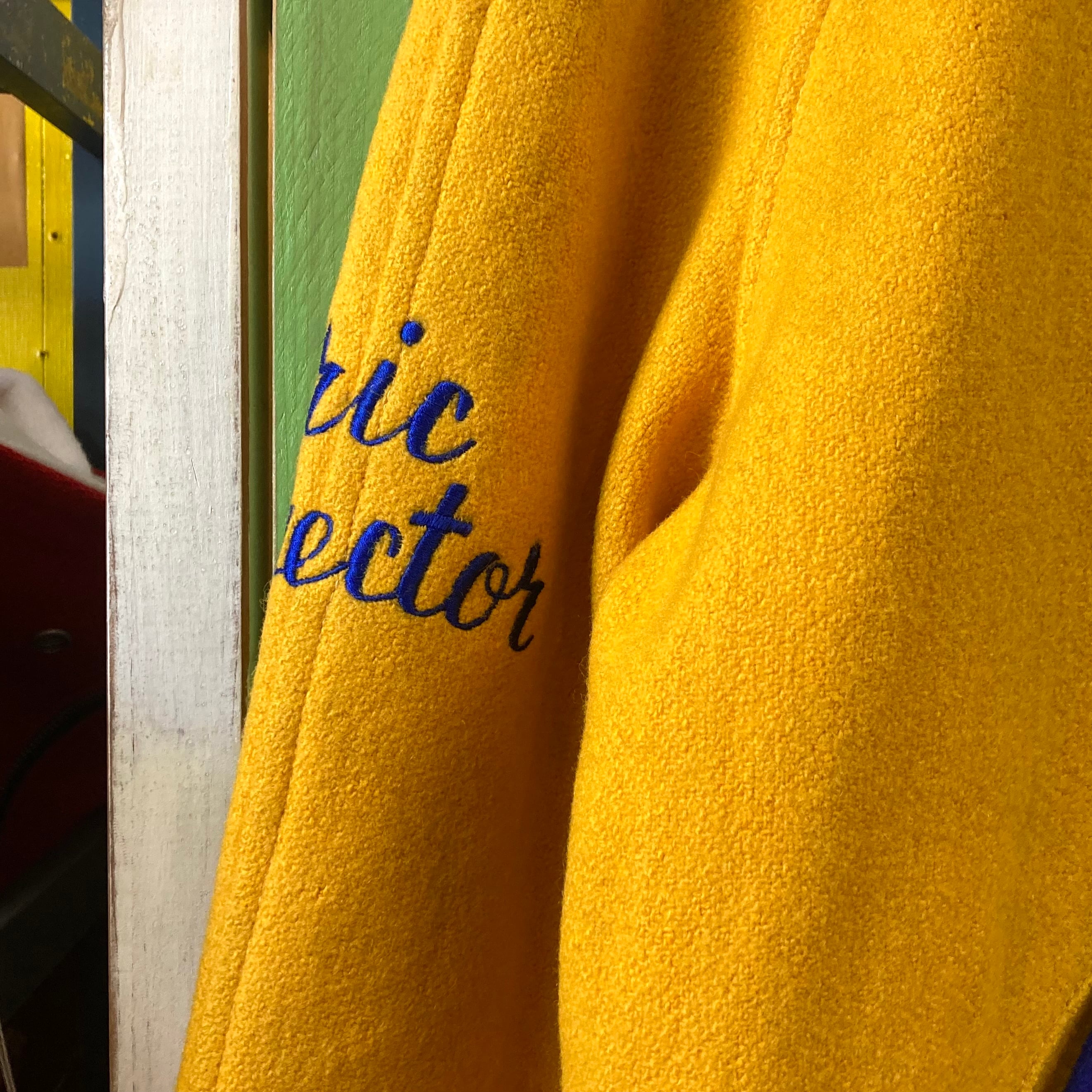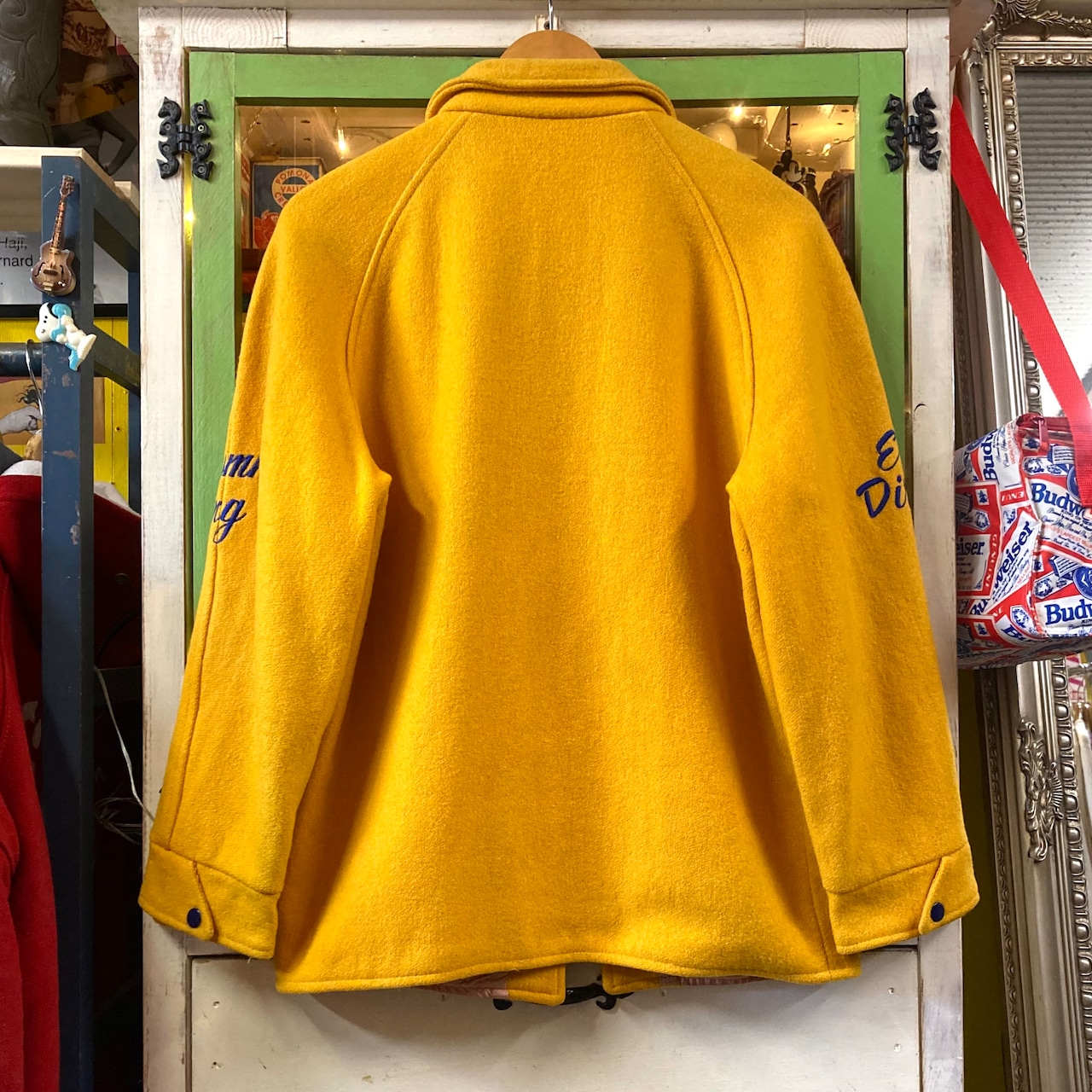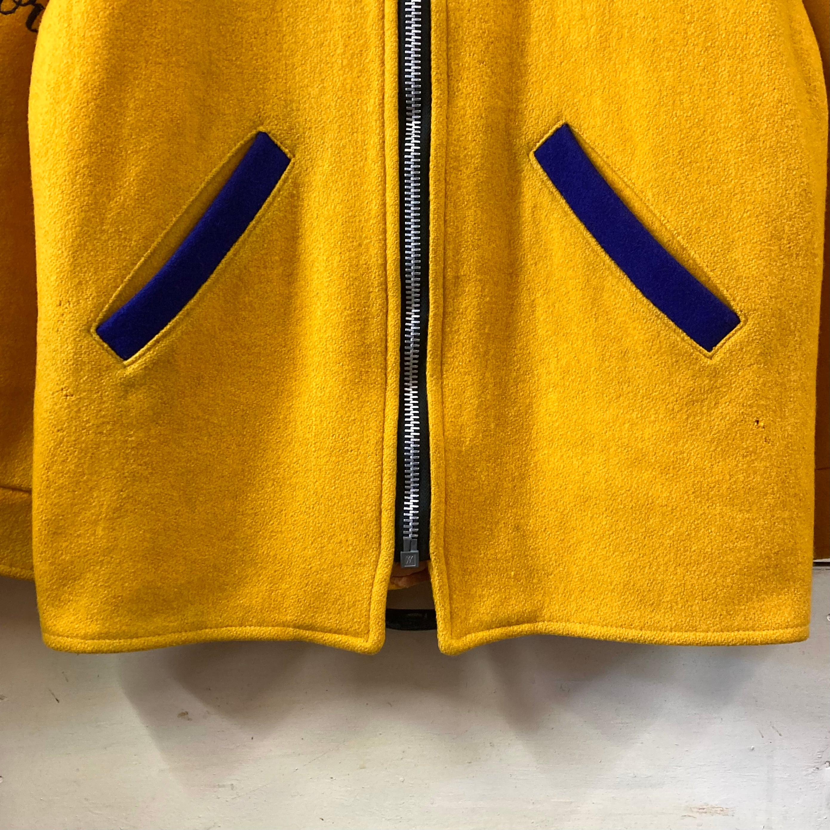 素材は肉厚なウールメルトン。マスタードイエロー×ネイビーの配色、ラグランスリーブのショート丈シルエットで50sらしい完成度の高い一着です。