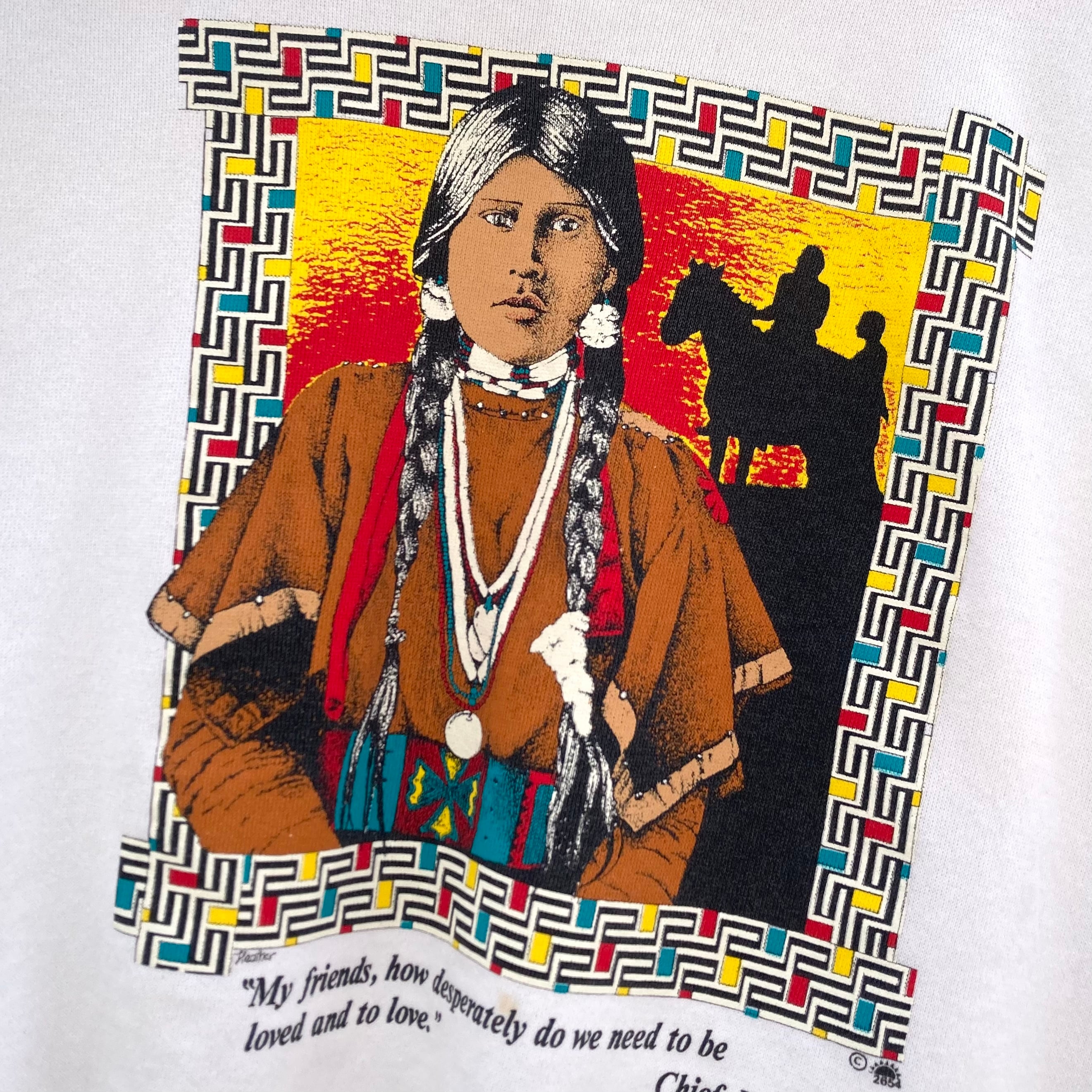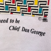 ネイティブアメリカンの人物と幾何学模様のフレームデザインが印象的な1着。フロントには先住民の俳優・詩人として知られる Chief Dan George の有名な言葉がプリントされています。
