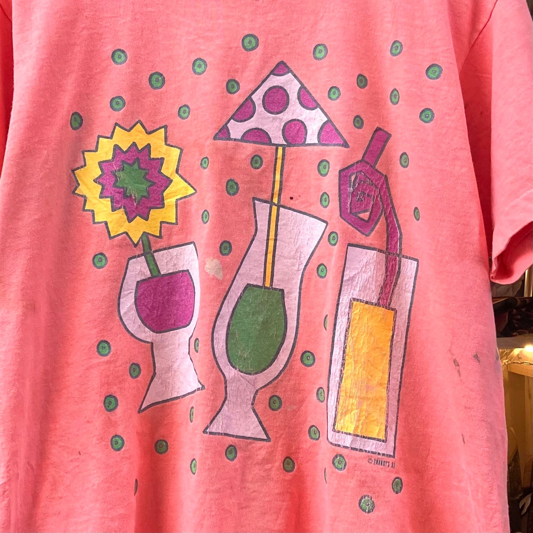 ©SHANT’S 88コピーライト入りのオリジナル。ピンクボディにカクテル×フラワーのデザインが映える、当時らしい80年代Tシャツです。